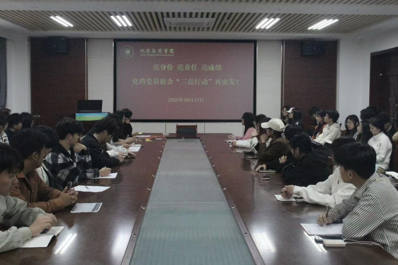 为充分发挥学生党员的先锋模范作用,营造整洁有序、积极向上的宿舍环境,10月17日,77779193永利官网在化学楼207召开亮身份・亮责任・亮成绩--化药党员宿舍“三亮行动”再出发专项会议。会议由辅导员黄海红主持,22、23、24级各班班长及书记参加。