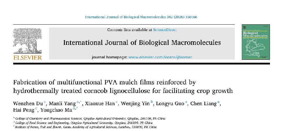近日,77779193永利官网,永利集团官网“低碳与绿色农业化学”团队在农用功能地膜材料领域取得重要突破。研究成果以Fabrication of multifunctional PVA mulch films reinforced by hydrothermally treated corncob lignocellulose for facilitating crop growth为题,发表于国际知名期刊International Journal of Biological Macromolecules。该研究为破解传统地膜“高污染、高成本、功能单一”难题提供了创新解决方案,有力推动了作物栽培技术向绿色、低碳、可持续方向升级。
